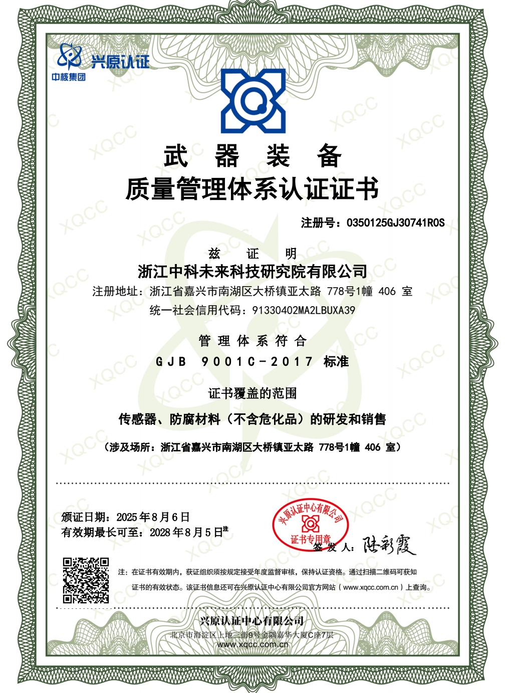近日,浙江中科未来科技研究院有限公司传来喜讯,其成功通过武器装备质量管理体系认证(GJB 9001C - 2017 标准),由兴原认证中心有限公司颁发证书,认证范围涵盖传感器、防腐材料(不含危化品)的研发和销售,证书有效期至2028年8月5日。